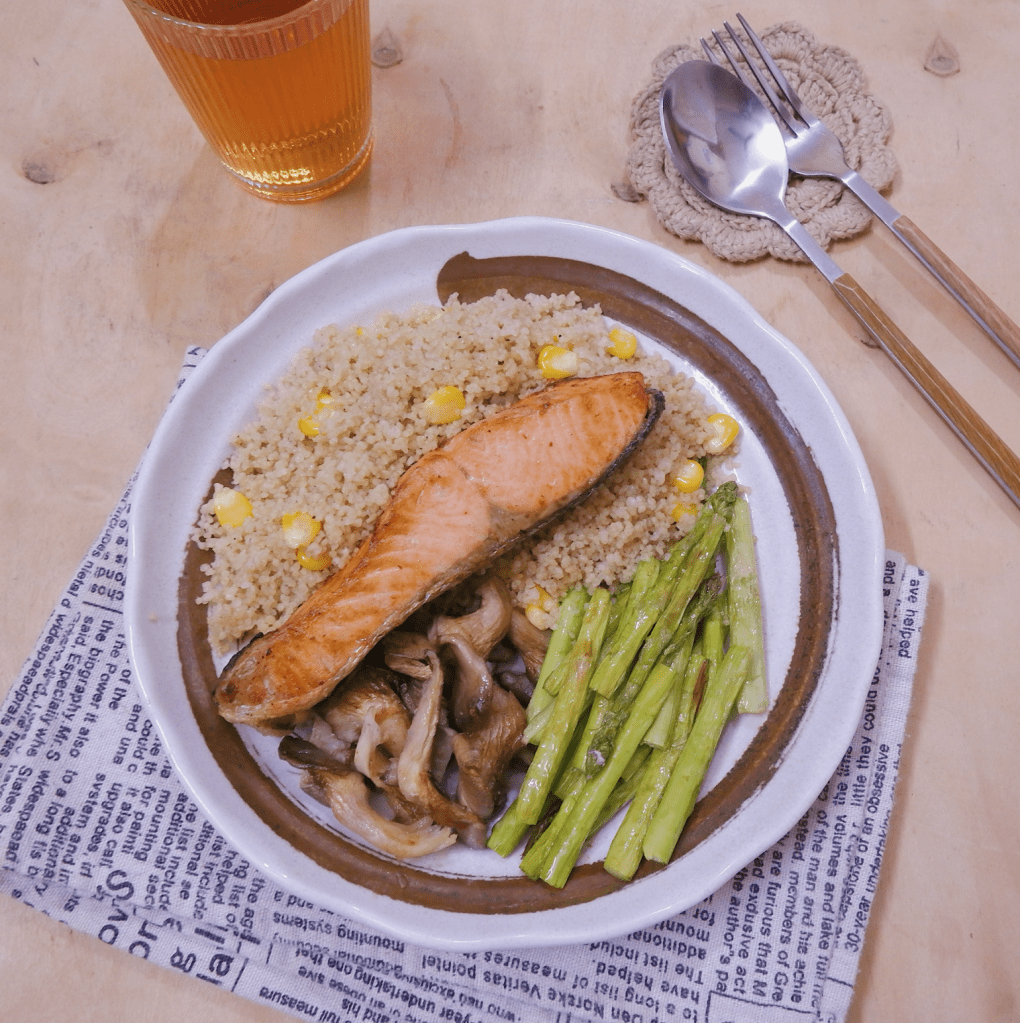 – Kiểm tra xem rau củ đã chín chưa, có thể gắp nấm và măng tây ra trước, lật mặt cá còn lại, nướng thêm khoảng 3 phút nữa là được.