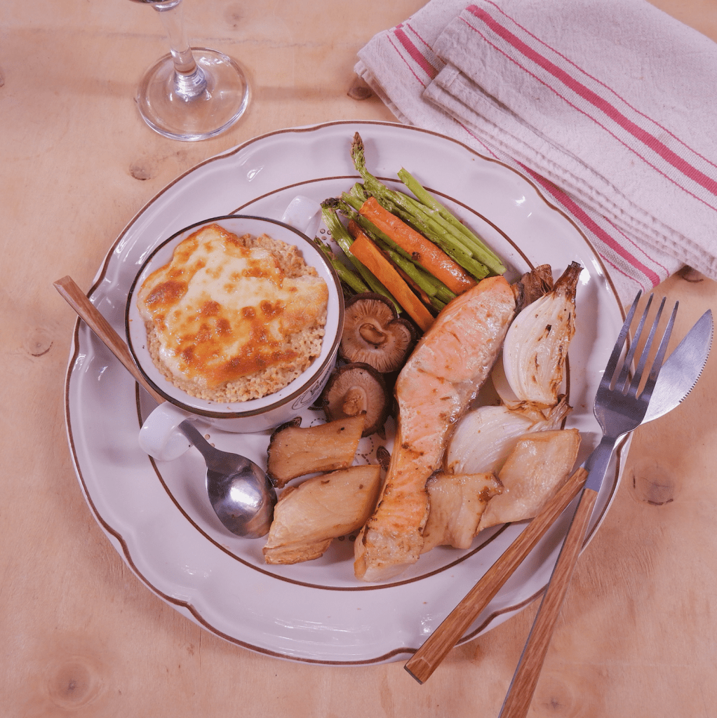 – Bày rau củ và cá lên đĩa, thêm couscous đút lò và ăn nóng với rượu vang.
