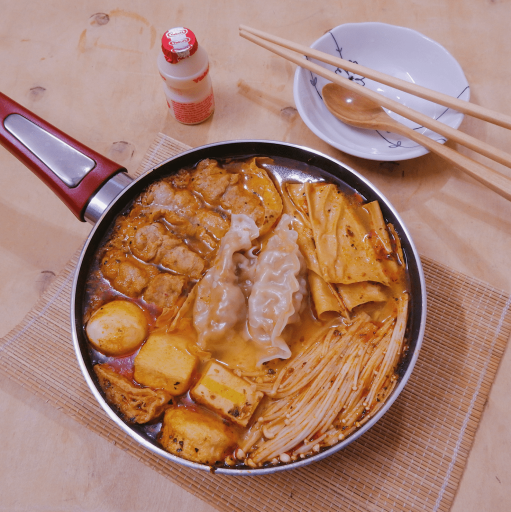 – Lót bắp cải xuống đáy nồi/chảo, xếp thịt bò, váng đậu, nấm kim châm, viên thả lẩu vào nồi. Rót nước dùng lên. – Đậy vung đun khoảng 2-3 phút cho thịt và nấm chín. Sau đó đặt mandu lên và đun thêm 2 phút nữa là có thể ăn được rồi.