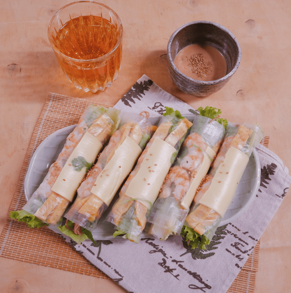 – Xếp xà lách lên trước, tiếp theo cho kinh giới, tía tô và rau thơm lên, xếp thêm một ít bún. Kế tới đặt trứng phô mai và trứng bên trên xà lách, cuối cùng là hai nửa tôm, úp mặt bên ngoài xuống để khi cuộn tôm sẽ đẹp hơn (Lưu ý: để cuốn chắc chắn thì các nguyên liệu nên được xếp cạnh nhau thay vì chồng chéo lên nhau. Nguyên liệu xen lẫn với bánh tráng giúp cuốn chặt chẽ hơn)