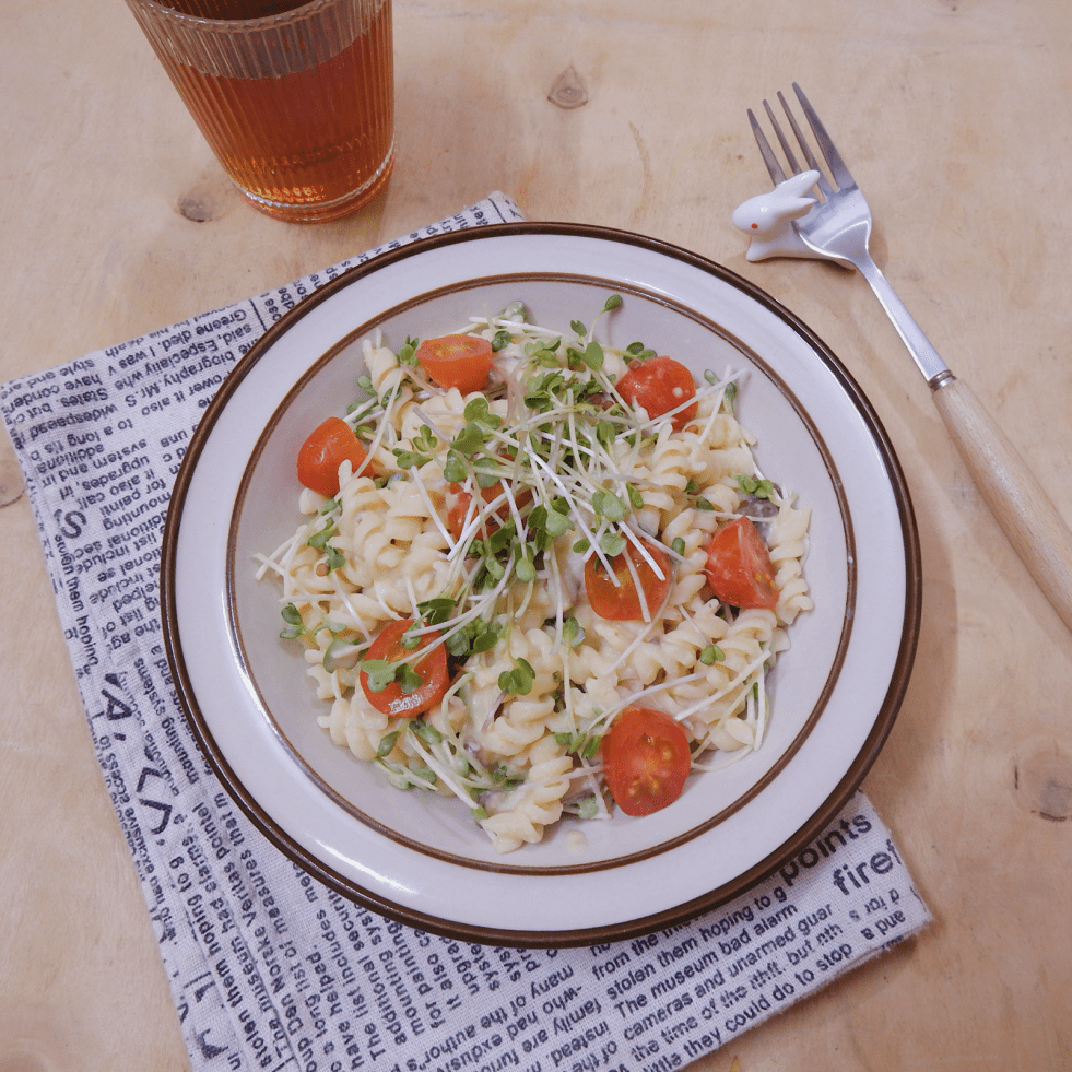 (2 người ăn) 140g nui xoắn (fusilli/hoặc bất cứ loại nui nào bạn có sẵn) 6 tbsp sốt hummus (công thức đã có trên blog) 10 quả cà chua bi 1 nhúm rau mầm Muối, tiêu và gia vị cơ bản Cách làm: - Đun sôi một nồi nước to, nên chọn nồi rộng, đổ… Continue reading Nui sốt hummus