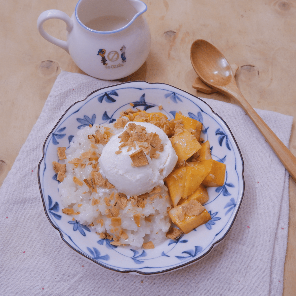 – Xoài gọt vỏ, thái miếng vừa ăn. Chia xôi lên đĩa, thêm xoài, múc lượng kem bao nhiêu tuỳ thích và rắc dừa sấy không đường lên. Bạn cũng có thể nấu phần sốt nước cốt dừa nhiều hơn để rưới thêm lúc ăn.