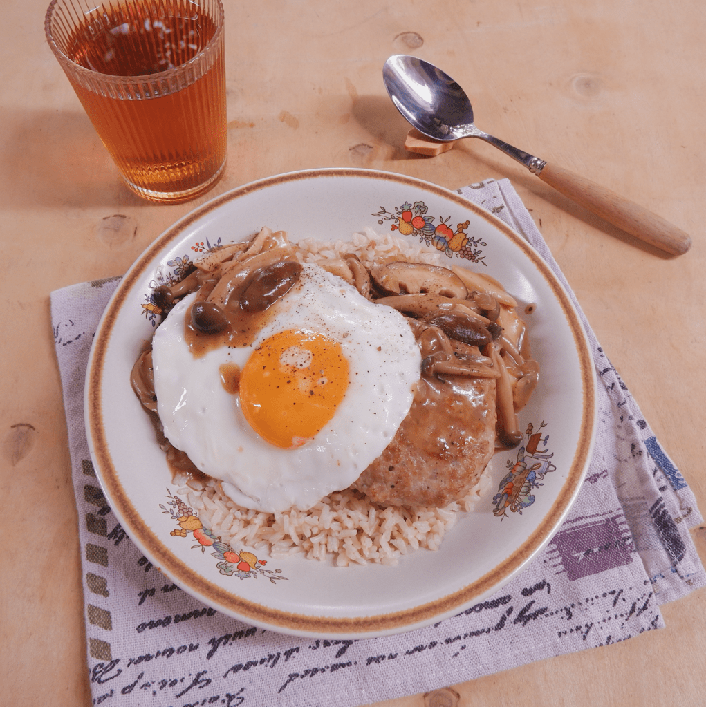 – Xới cơm lên đĩa, thêm thịt viên, sốt nấm và trứng lòng đào lên, rắc thật nhiều tiêu và ăn nóng.