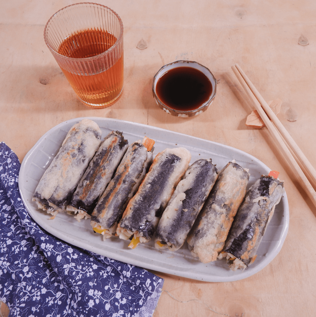 – Pha bột chiên giòn thành hỗn hợp sệt, láng dầu lên chảo, nhúng các cuộn cơm mini vào bột, chiên vào trên chảo, nếu bột chảy xuống khi bạn đặt cuộn cơm vào chảo, có thể đẩy nhẹ để cuộn cơm lăn tròn ôm lấy phần bột chiên.