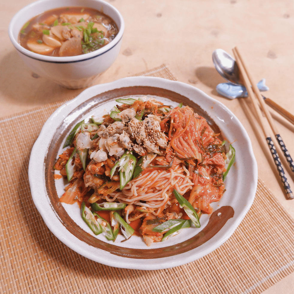 (2 người ăn) 2 gói mì nưa 150g kimchi 50g nước kimchi 6-7 quả đậu bắp 200g thịt nghêu (mua sẵn hoặc tự hấp lấy nhân) 1 tbsp tương ớt Hàn Quốc Gochujang 1 tsp ớt bột Hàn Quốc (Gochugaru) 2 tbsp xì dầu 2 tsp mật ong 1/4 tsp dầu vừng Muối, tiêu và… Continue reading Mì nưa trộn kimchi và nghêu