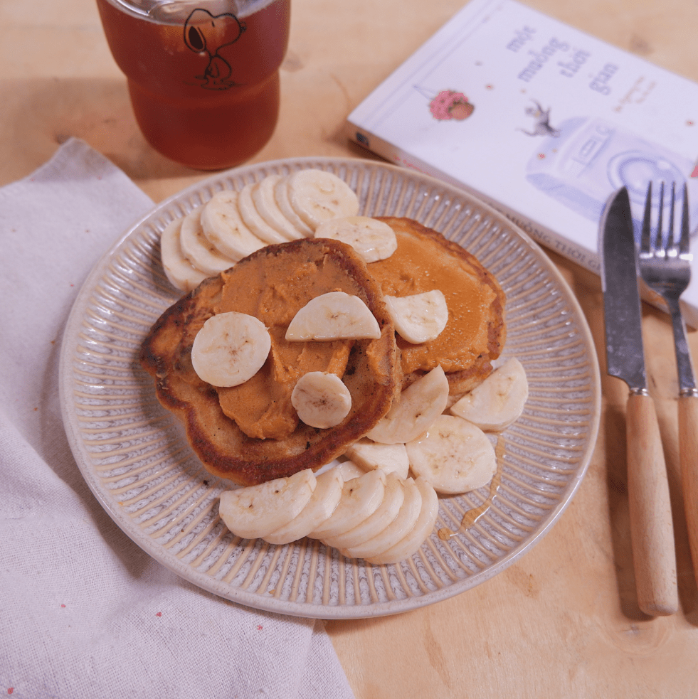 Pancake với chuối và sốt đậu nành rang