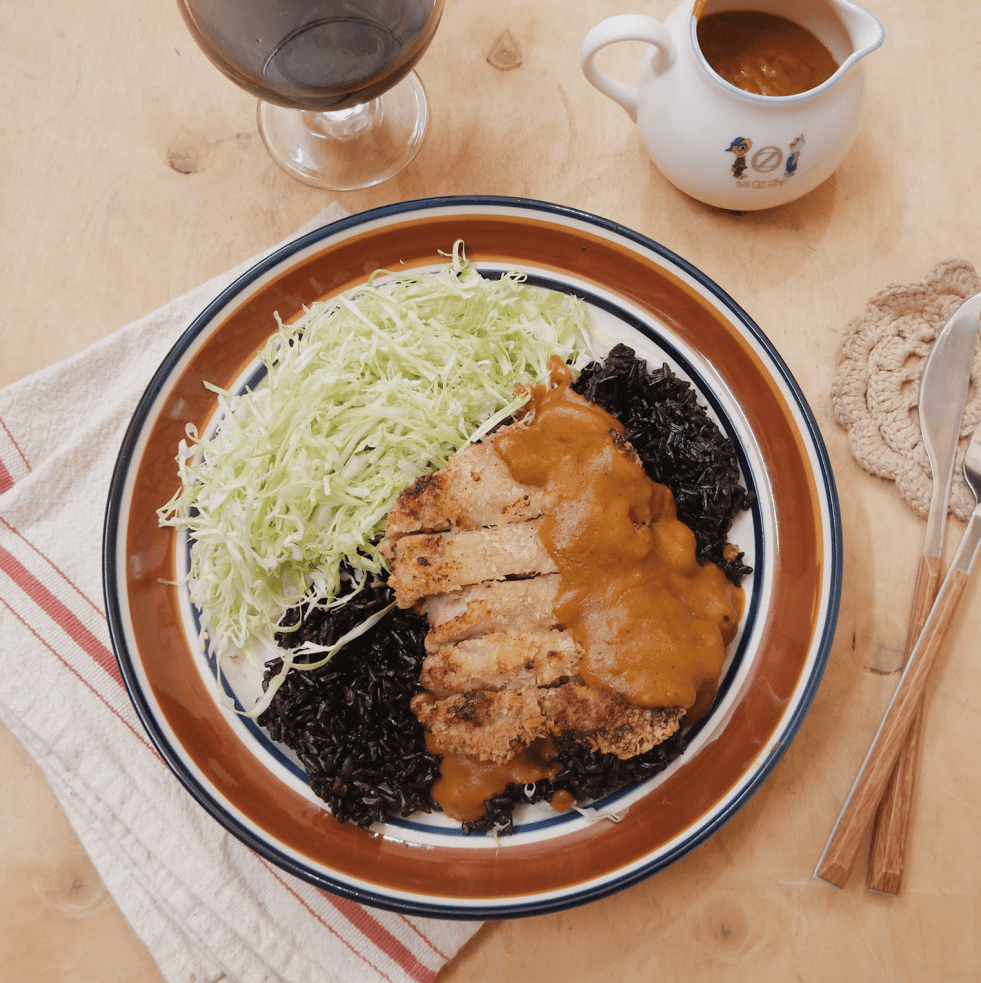 Thịt heo tẩm bột chiên, cơm gạo lứt và sốt cà ri